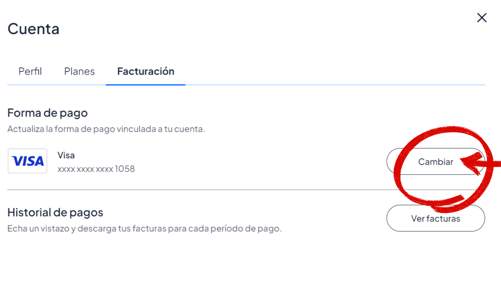 En el apartado «Facturación» verás el título de «Formas de pago» y a la derecha el botón para cambiar tu tarjeta.